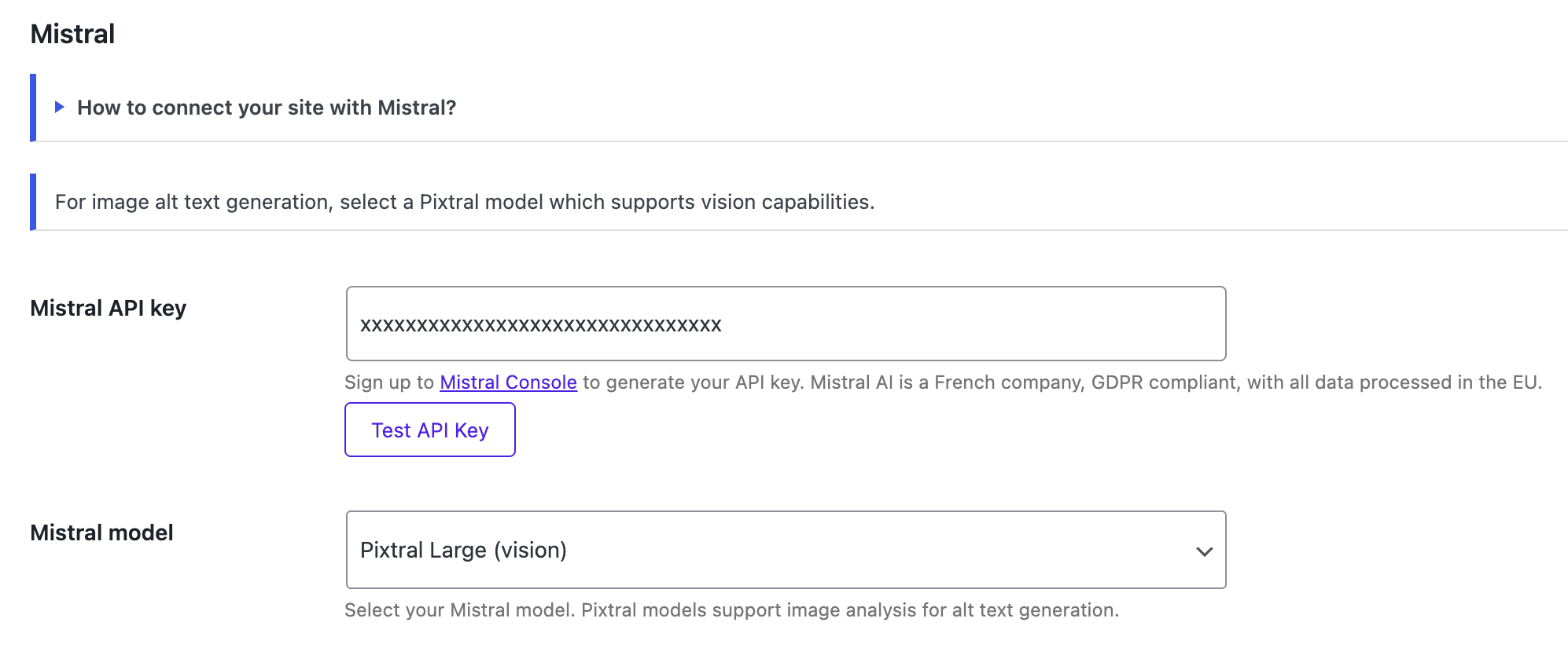 Esto almacenará tu clave API de Mistral en el archivo wp-config.php en lugar de en la base de datos. Esto es más eficiente en una red multisitio, por ejemplo, y también más seguro.