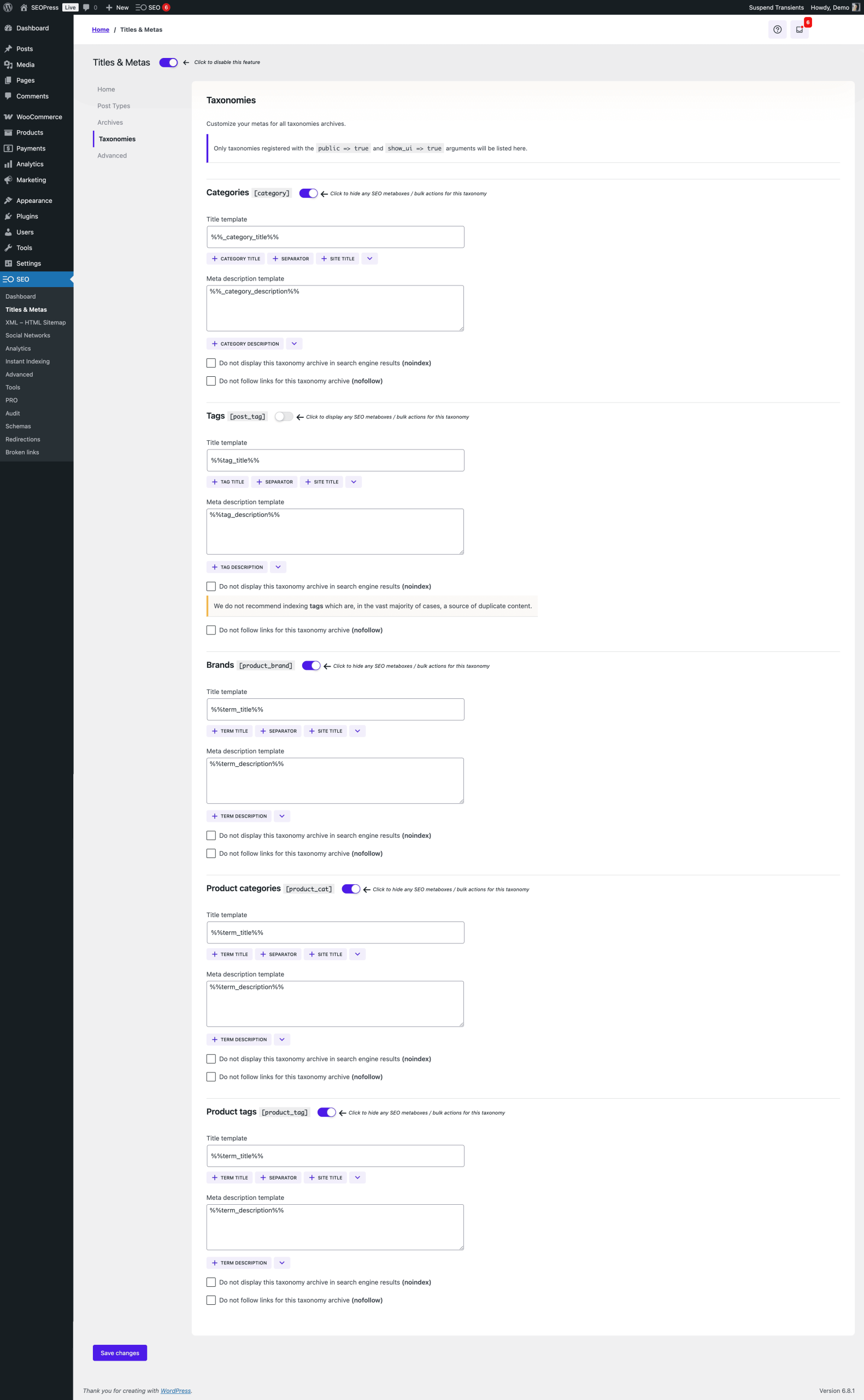With the same settings as Posts, this section lets you customize titles, descriptions, and SEO options for your core static pages (contact, about, etc.), which are essential for site navigation.