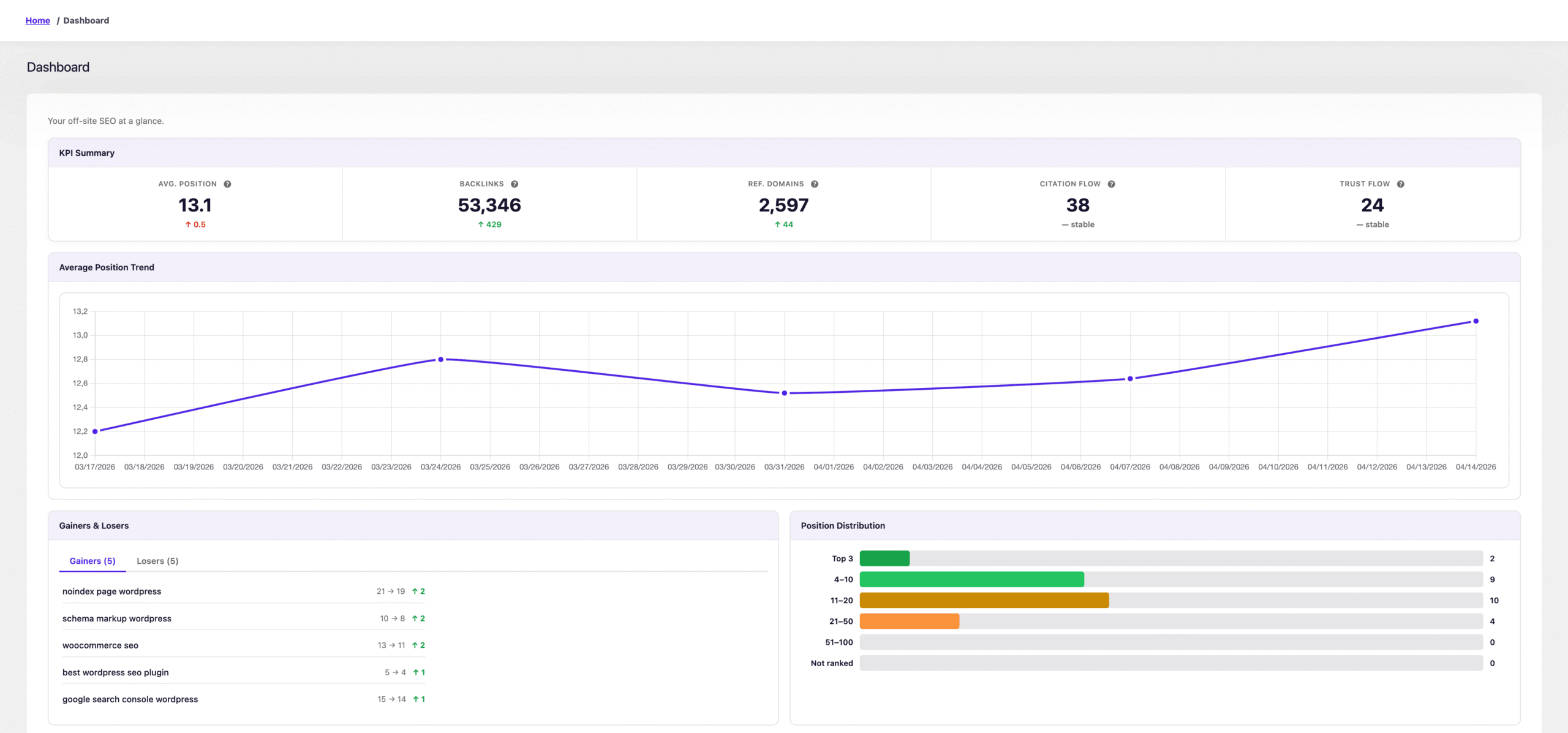 Nouvelle interface utilisateur avec des widgets à glisser-déposer pour une meilleure vue d’ensemble de votre référencement hors site, avec des suggestions SEO, un résumé des indicateurs clés de performance (KPI), les sites en hausse et en baisse, la répartition des positions et bien plus encore !