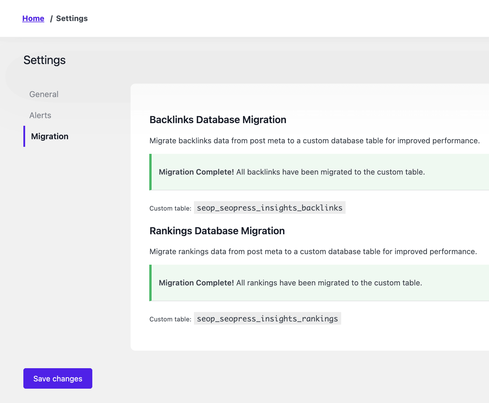 Une fois la migration terminée, une notification verte s’affichera : « Migration terminée ! Tous les backlinks ont été migrés vers la table personnalisée. »