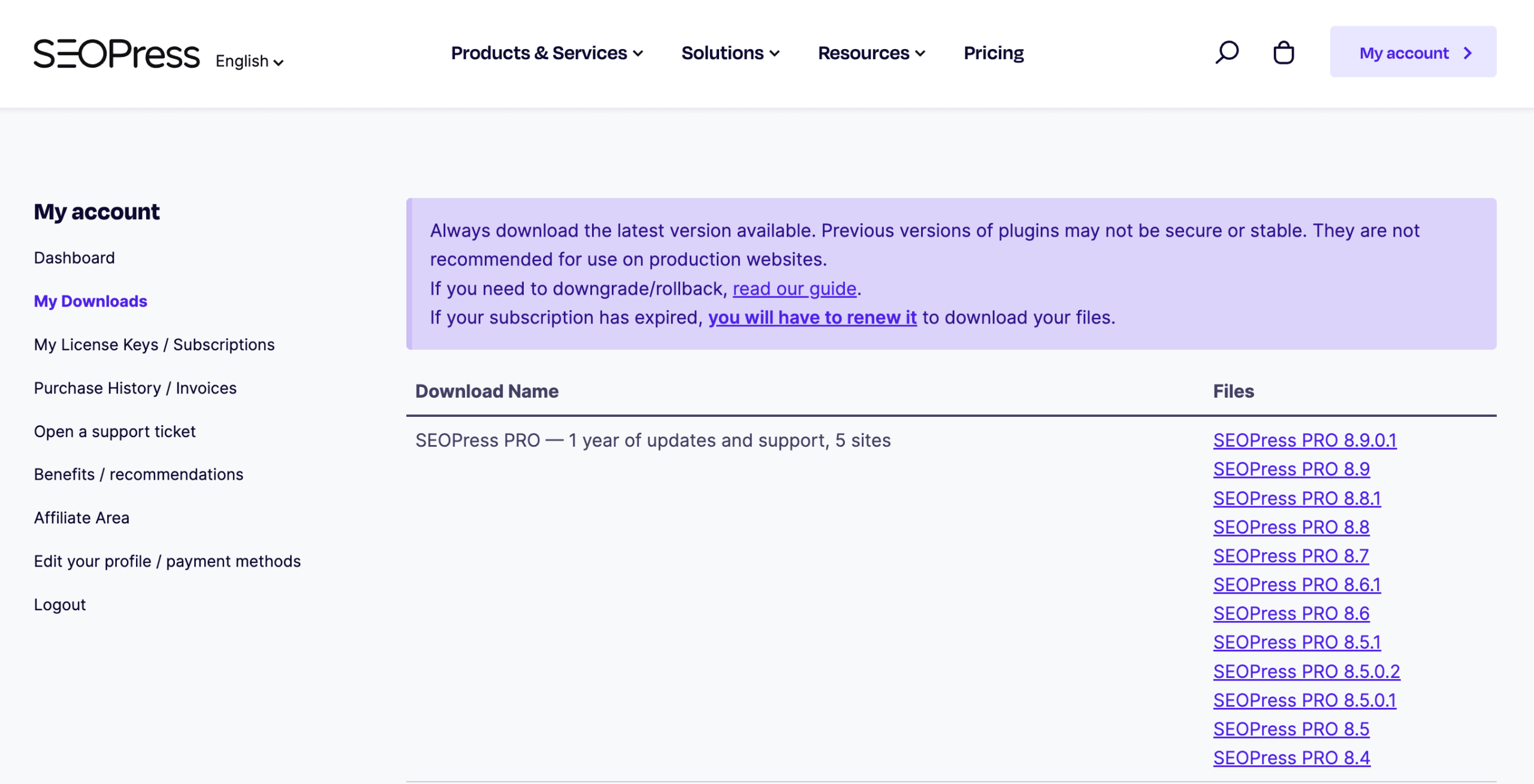 Versions précédentes de SEOPress Free – Répertoire officiel des extensions WordPress - SEOPress PRO (depuis votre espace client, toggle Mes Téléchargements)