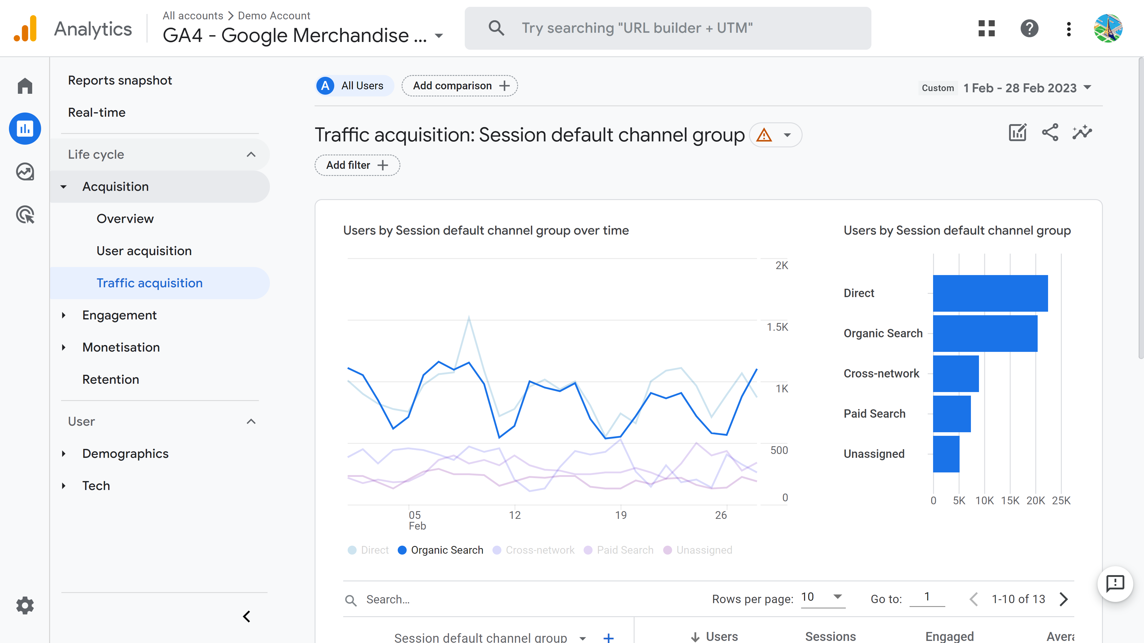 As part of this week’s SEO routine we recommend you check your search engine traffic for the previous 30 days. In Google Analytics, navigate to the Traffic acquisition report via the right-hand menu Reports > Acquisition > Traffic acquisition. Click on “Organic Search” in the legend of the graphic to focus on that line (Organic traffic excludes traffic from Google Ads).