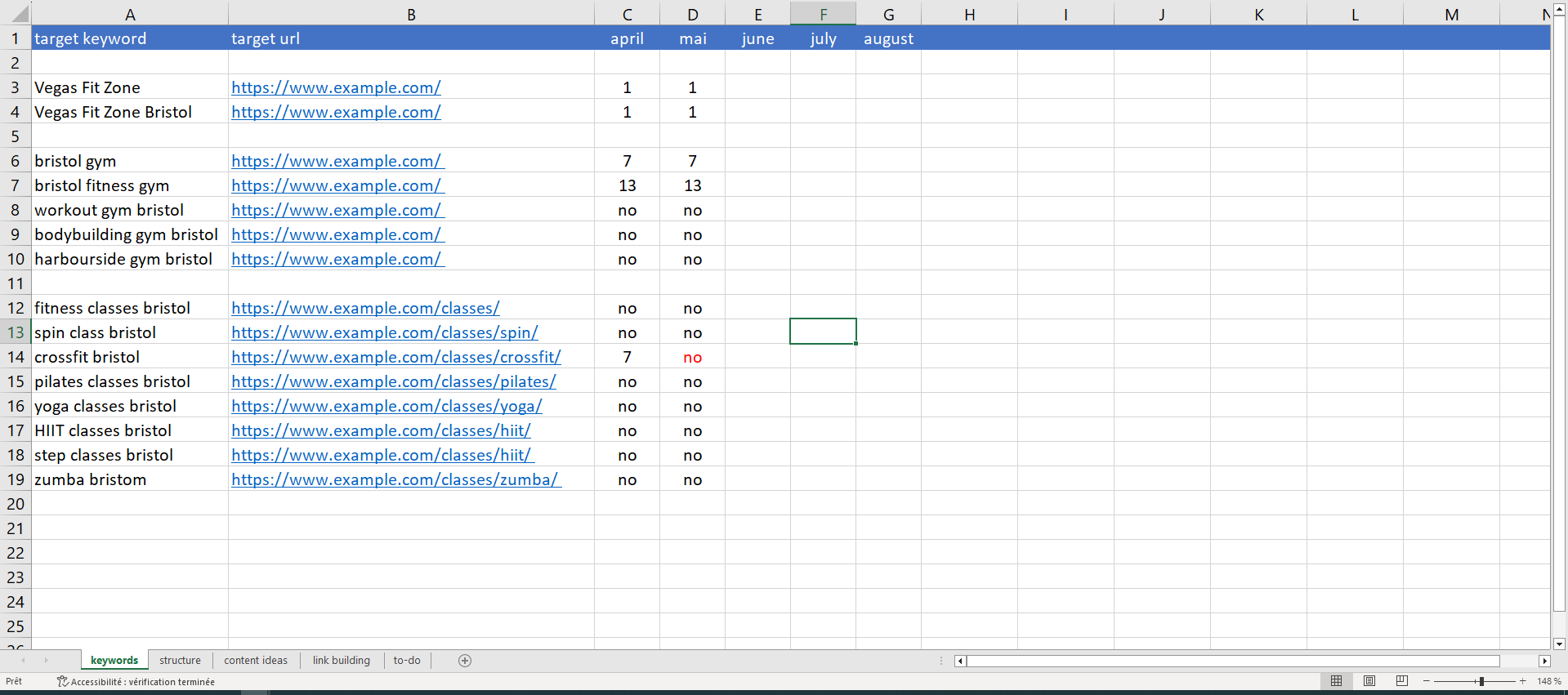 These keywords have been added to the SEO spreadsheet as target keywords and we have associated a target URL to each keyword. This means that this is the URL that we expect to rank for the particular keyword.