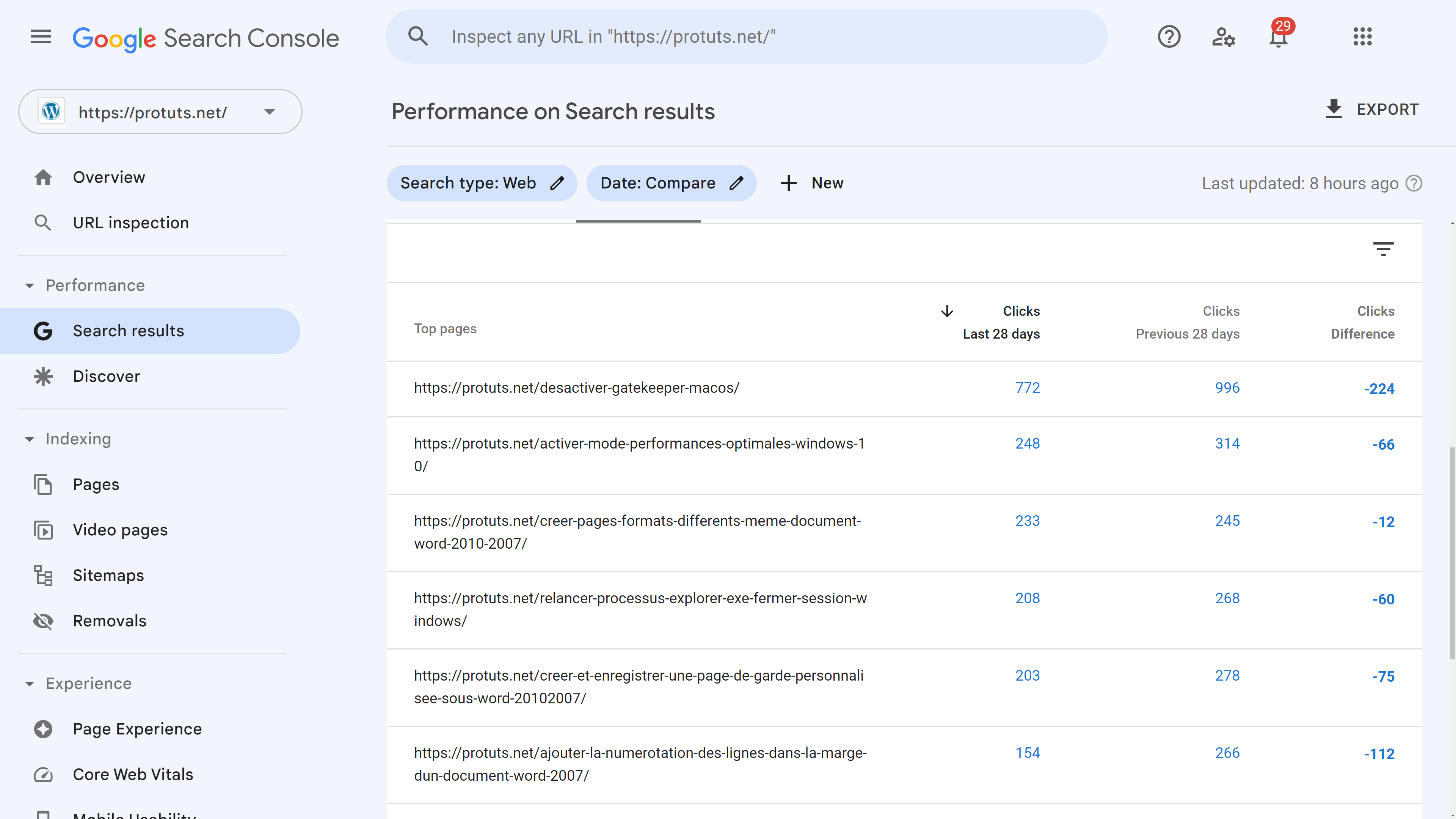 - Check Google Search Console Performance, Page Indexing and Page Experience reports