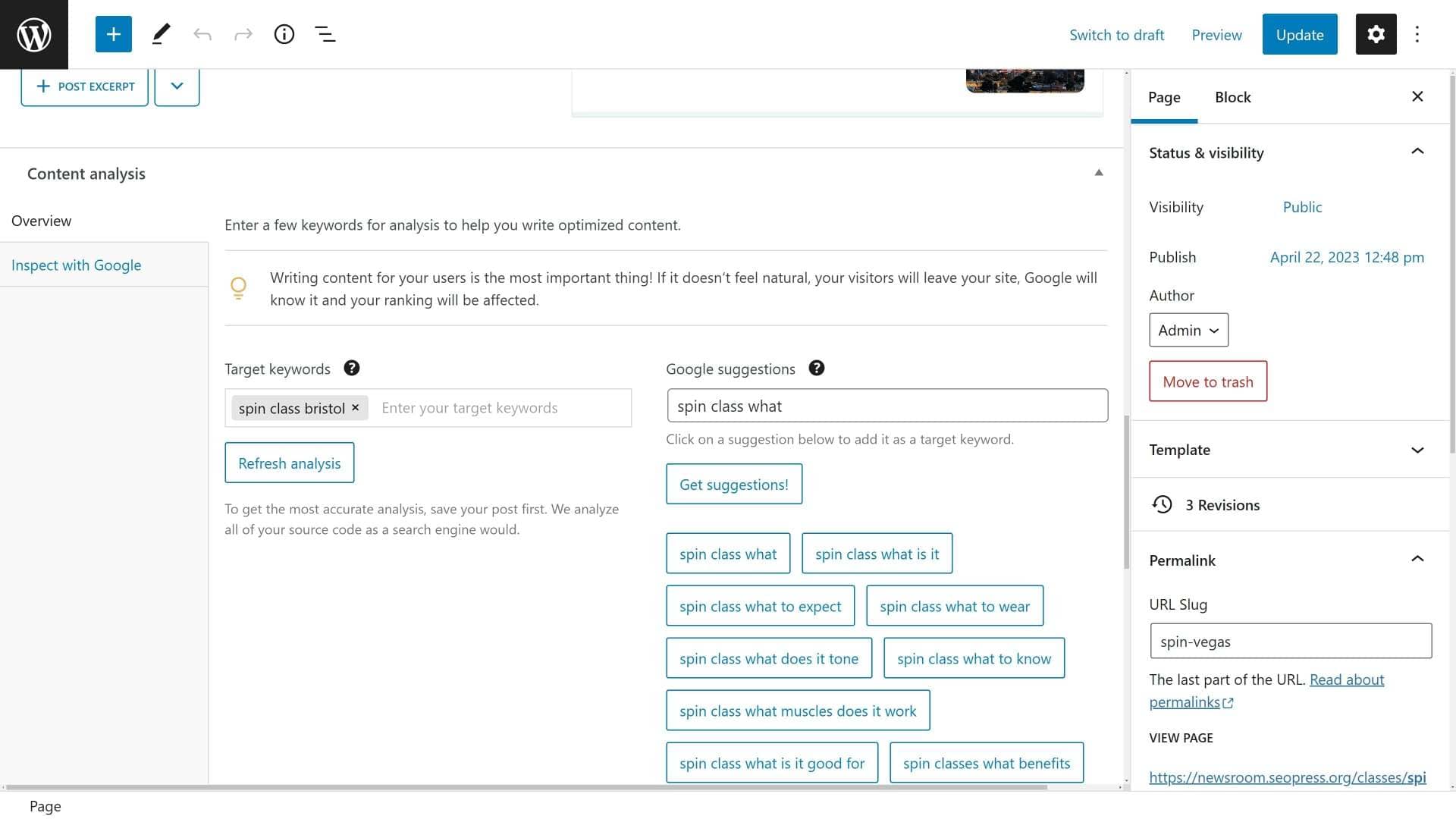“Benefits of Spin Classes” is a great idea of an article. During your keyword research, you may also find some great ideas for articles. If you are not going to write these articles now, in the 2 hours you have for SEO this week, note the article idea in your SEO spreadsheet so as not to forget it!
