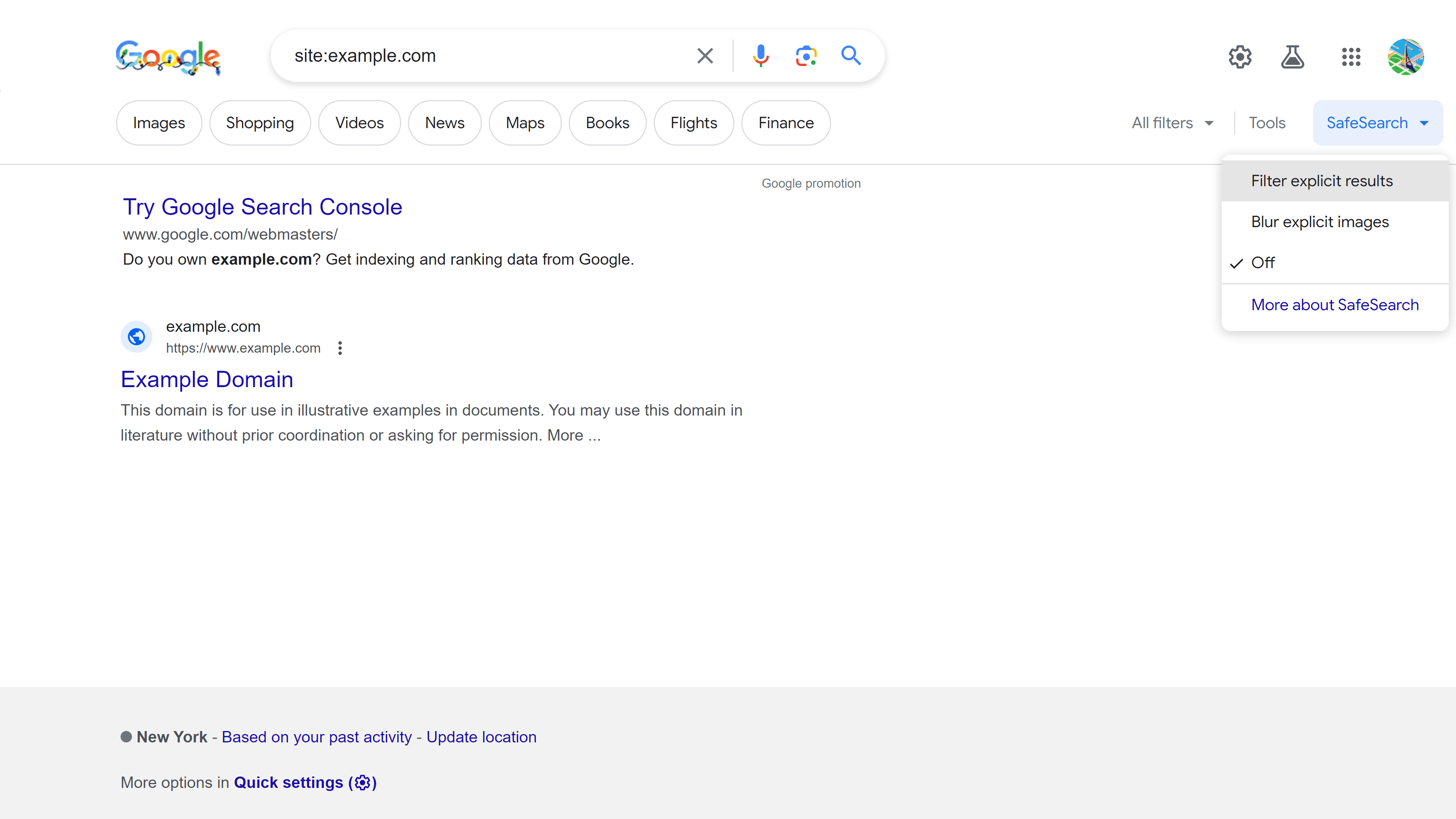 (there are no spaces between site and the domain name). It is also recommended that you turn SafeSearch off. SafeSearch is a feature that blocks explicit content like pornography and graphic violence from showing in search results. You may be thinking that your site doesn’t have this type of content, but you need to check that this type of content hasn’t been added by malicious third parties. It may be one of the causes of ranking problem.